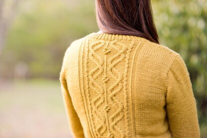 A cute little diddy! The cable pattern in this cardigan reminds me of the double helix structure of DNA. So I named it Rosie after Rosalind Franklin who was very instrumental in the discovery of the structure of DNA. I shorten the name to better reflect the sweet playfulness of the sweater. I used Shibui Drift for the sample and it is so soft and feels lovely next to the skin.