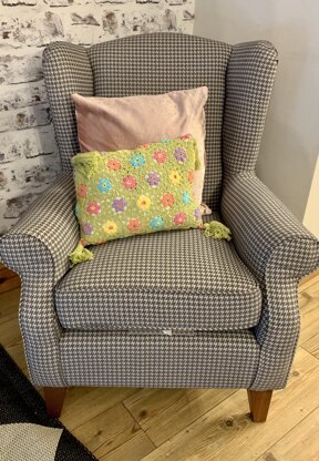 this delicate flower cushion is made up of lots of little hexagons to give a really pretty floral design , still packing a punch with its bright zesty palate
