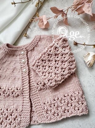 This sweet little jacket is knitted from the bottom up, and the sleeves are worked flat then joined to the yoke. This means minimal seaming, and is perfect for dressing up any outfit. Would certainly dress up baby’s Christening outfit if knitted in traditional white.