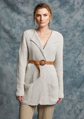 beautiful sweater open or cinched with a belt. The sweater showcases an allover