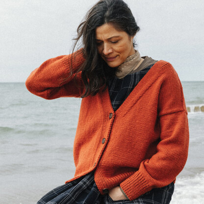 Rowan Foxy Bay from Pebble Island is a wardrobe staple, reliable, unfussy, and perfect with jeans, joggers, or dresses. The fun part of this women’s cardigan is to pull it over your head the other way, and you have a v-neck sweater with button-back detail. So there are two garments in one for those days when you don’t know if you are coming or going. Rowan Pebble Island is a unique wool yarn produced from a flock of Polwarth Merino sheep raised and hand-sheared on the Falkland Islands. This soft worsted weight wool is incredibly versatile, working up beautifully into garments and accessories.
