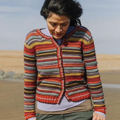 Rowan Pleateau Plain from Pebble Island is an indispensable women’s cardigan in a single color or a six-color random stripe sequence where the color change rows are featured on the front of the fabric instead of being hidden on the inside. The sweater is knit flat in pieces from the bottom up and then seamed. Rowan Pebble Island is a unique wool yarn produced from a flock of Polwarth Merino sheep raised and hand-sheared on the Falkland Islands. This soft worsted weight wool is incredibly versatile, working up beautifully into garments in simple stitches and intricately cabled accessories or colorwork sweaters.