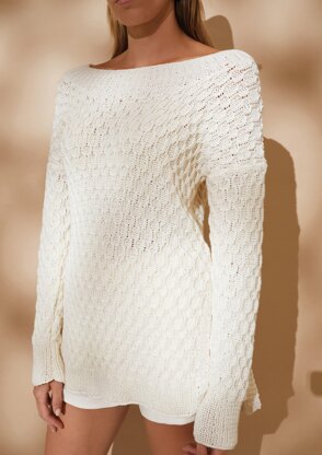 flattering boatneck, elongated honeycomb allover cable pattern, and dropped