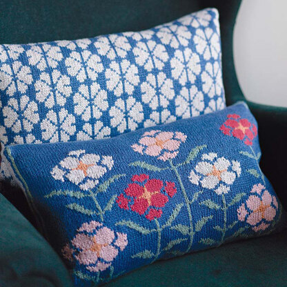 Rowan Agda by Arne & Carlos is designed on a foundation of Norwegian folk art and a playful love of color knit in Softyak DK. This cushion has the option of a large floral motif and a geometric pattern which can be used with a plain pillow back or paired for a spectacular effect. Rowan Softyak DK is a blend of yak, cotton, and nylon that has the best of all worlds: the softness of cashmere combined with durability and washability. The intarsia patterns are in chart form only.