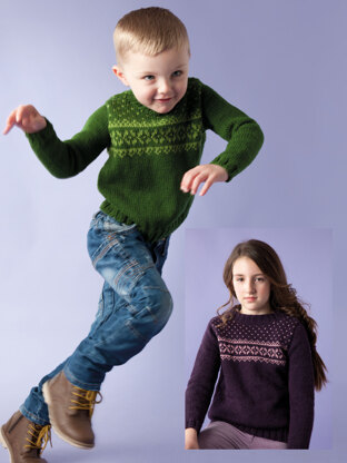 Austin is a children's design with simple colorwork patterning on the yoke. Using Rowan’s delightfully soft, machine-washable Pure Wool Superwash Worsted, this stockinette stitch design features a fair isle yoke and set-in sleeves. Both the sweater and tunic length options are knit flat in pieces from the bottom up and seamed. Colorwork pattern is charted only.