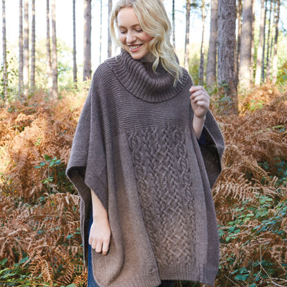 Rowan Bowland from Moordale is a knitting pattern for a women’s poncho knit in Moordale. With a cable panel to the front and chunky rib roll neck, this versatile poncho is perfect for keeping warm on morning walks. Rowan Moordale, a gorgeous blend of British wool and alpaca blend that is perfect for garments you’ll wear every day. This DK weight yarn boasts a color palette of soft heathered shades, which show off texture and cabled-stitch patterns wonderfully. The cable pattern is in chart form only.
