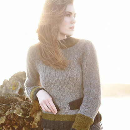 Rowan Carmel is a women’s color block sweater knit in Brushed Fleece. The lovely pullover has a round neckline with mock pockets and set-in sleeves. This knitting pattern is for the beginner knitter and relatively quick knit and a fabulous addition to your wardrobe. Rowan Brushed Fleece is a wool and alpaca blend in a bulky weight that has a soft marled effect in luscious colors that works up quickly.