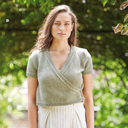 Rowan Chamoisette designed by Sarah Hatton is a short-sleeved wrap-over cardigan. It features set-in sleeves and is a lovely addition to any summer wardrobe. This exquisite garment is knit in Rowan Cotton Cashmere a fabulous cotton and cashmere blend that drapes beautifully and is also machine-washable.