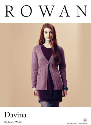 Davina from Rowan is a feminine cardigan with single-button closure, cable panels, garter stitch edgings, and set-in sleeve construction. Knit in Pure Wool Superwash Worsted, the placement and design of the cable panels creates subtle waist shaping that is very flattering.