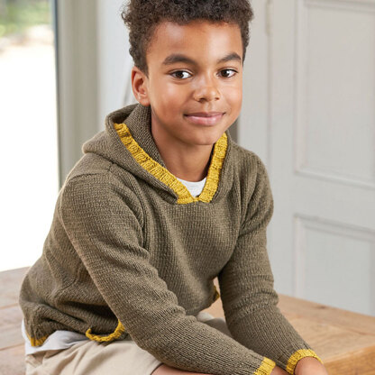 Rowan Dennis from Cape Bay is a child’s pullover hoodie knit in Softyak DK. You can’t go wrong with a hoodie, particularly if it’s got that all essential kangaroo pocket—the ideal hiding place for beach-combed treasures. Dennis is knit flat in pieces from the bottom up and then seamed. Rowan Softyak DK is a blend of yak, cotton, and nylon that has the best of all worlds: the softness of cashmere combined with durability and washability. The darker yak fibers create a beautiful melange with the dyed cotton.