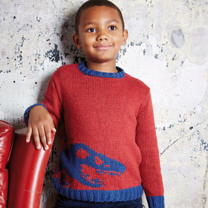 Rowan Dino, designed by Martin Storey, is perfect for dinosaur enthusiasts. This pullover features a dinosaur skull worked in intarsia. This fantastic piece is knit using two shades of Rowan Softyak DK, a blend of yak, cotton, and nylon that has the best of all worlds: the softness of cashmere combined with indestructibility and washability. The darker yak fibers create a beautiful mélange with the dye. The intarsia pattern is charted only.