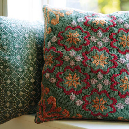 Rowan Greta by Arne & Carlos is designed on a foundation of Norwegian folk art and a playful love of color knit in Softyak DK. This cushion has the option of a large floral motif and a geometric pattern which can be used with a plain pillow back or paired for a spectacular effect. Rowan Softyak DK is a blend of yak, cotton, and nylon that has the best of all worlds: the softness of cashmere combined with durability and washability. The intarsia patterns are in chart form only.