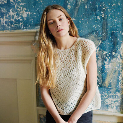 Rowan Halycon is a short-sleeved women’s pullover featuring a delicate all-over lace pattern, A-line shaping, and a reversible design for either a v-neck or crew neck look. This sweater is knit in the round to the armholes and seamed at the shoulders. Cashmere Haze is a luxurious blend of alpaca, cashmere, and silk that has a delectably soft halo. That softness paired with the strength of silk produces a gorgeous, lightweight fabric, creating a stylish layering piece that you can wear over camisoles or dresses to add warmth and elegance. The lace pattern is written only.