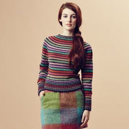 Rowan Lexy is a colorful, fitted pullover worked in the round from the bottom up. Featuring alternating thick and thin stripes and deep ribbed trims, this classic sweater is sure to be a favorite. Lexy is knit in Pure Wool Superwash Worsted, making it an easy-care project too!