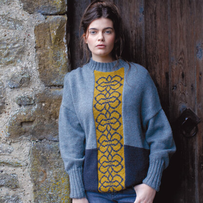 Isle pattern in the center front, with drop shoulders. Lingmell is knit flat in pieces from the bottom up and seamed together. Rowan has brought