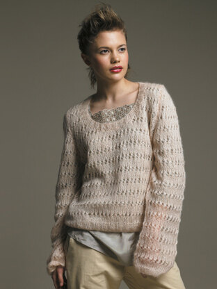 Lucetta from Rowan is a loose fitting sweater that is luxuriously soft and light as a feather. Knit in Rowan Kidsilk Haze, this scoop neck sweater has a pretty eyelet design and is ideal for layering to add warmth and elegance to any outfit. This pullover is knit flat in pieces from the bottom up and seamed.