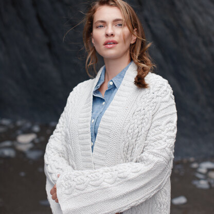 moss stitch and cable panels knit in Denim Revive. This is perfect to wrap
