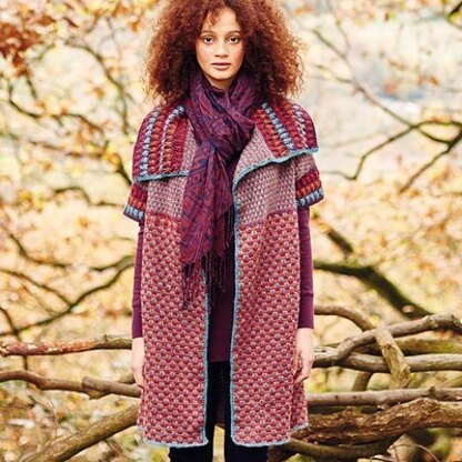 Knit this long length ladies jacket worked in Rowan Felted Tweed. Quebec has short sleeves and an oversized collar. It has all over colorwork and a beautiful drape. This is the perfect piece for your fall wardrobe.