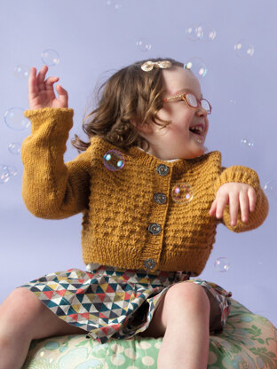 Shae from Rowan is an simple yet adorable child’s textured cardigan. Using Rowan’s wonderfully soft, machine-washable worsted weight yarn, Pure Wool Superwash Worsted, this round-neck cardigan has ribbed edgings and set-in sleeves. Shae is knit flat in pieces from the bottom up and seamed.