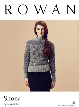 Shona, worked in wonderfully soft Rowan Pure Wool Worsted, is a basic women’s pullover with funnel neck and set-in sleeves. The body of this sweater is knit with the yarn held doubled, creating a fun marled fabric.
