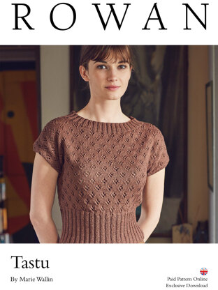 Tastu is a beautiful short-sleeved summer top. Knit with Rowan Soft Yak DK it has deep ribs with an allover lace pattern.