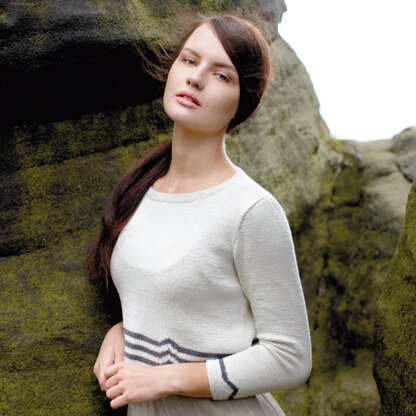 Rowan Tern from Summerlite Horizons designed by Georgia Farrell is a neat women’s sweater with three-quarter sleeves and a contrasting stripe design knit in Summerlite 4 Ply. This pullover is knit in the flat from the bottom up and then seamed together for stability. Rowan Summerlite 4 Ply is a fingering weight 100% cotton yarn that comes in lovely solid colors and is machine washable. The colorwork pattern is in chart form only.