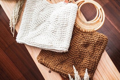 Working in continuous rounds, we will first work up the optional yarn bag handle, then the bag body. Next, working in rows, we will create the base and stitch the two together. Lastly, if using a store-bought handle, it will be added to the bag.