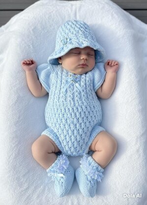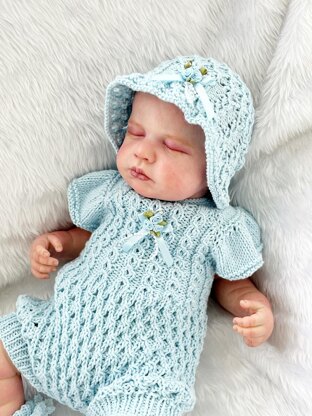 A pretty romper set with a matching bonnet and booties. Knitted on straight needles back and forth with line-by-line instructions. The romper is knitted from the top down, so minimal sewing is needed. It buttons up with 5 buttons on the back but can be worn with the buttons on the front. The sunhat is knitted from the bottom up. The little socks are knitted on two needles back and forth and are also quick to knit up and complete this beautiful little set.
