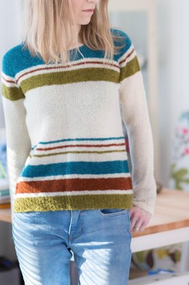 Beautiful striped sweater, worked seamlessly from top down. The upper body is worked back and forth until the neckline shaping is complete. The rest of the sweater is worked in the round. The body is slightly A-shaped and the edges are finished with a Garter rib. The pattern includes a photo tutorial for lifted increases. Please note that the length of the CC1 section in the upper body (color Kajo in sample photo) gets gradually longer as the sizes go up. Have fun choosing your favorite color combination!