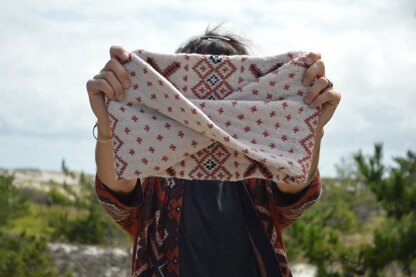 The Santa Fe Mobius is a small mobius style cowl inspired by the southwest. The graphic color work motifs are reminiscent of woven blankets and the warm terra cotta color is an ode to the dessert. The cowl is worked in the round and the provisional cast on edge is joined to the final round to create a seamless edge and mobius shape. Knit up in Brooklyn Tweed Peerie yarn there are endless possibilities to customize a cowl with colors you love!