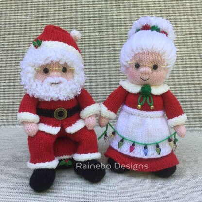Santa & Mrs. are knit in the round, using Magic Loop or double pointed needles. The base/body/feet or legs/body, arms and head are all knit on as you work along. The clothing is not removable. They are approx. 9” tall, and Santa sits upon a round, festive seat cushion. Santa & Mrs. would be a wonderful decoration for Christmas! They are created using #4-Worsted Wt. (Aran/10-ply) yarn: SANTA: Body Color: 60 yds.,Red Color: 130 yds., White Color: 120 yds., Black Color: 30 yds., Hair/Beard Color: 50 yds. MRS.: Body Color: 50 yds., Red Color: 80 yds., White Color: 90 yds.,Shoes Color: 15 yds., Hair Color: 50 yds.SEAT CUSHION: Black Color: 40 yds., Red Color: 40 yds., White Color: small amount... 2” diameter Plastic Canvas Circle (For base of Mrs.: could be cut from rectangle piece), 2 ½” Plastic Canvas Circle (For Santa’s Seat: could be cut from rectangle piece), Button for “Buckle”- ¾” for belt, Decorations, 2.25” doll glasses, Crochet Hook (for attaching hair), Iron & Board