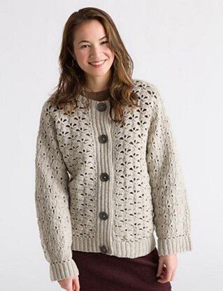 The body is worked in one piece from the bottom up to the underarms. Chain sts are added for the left sleeve then the left front and sleeve are worked to the shoulder. Chain sts are added for the right sleeve then the back, and back sleeves are worked to the shoulder. Then the right front and sleeve are worked to the shoulder. The back and front sleeves are joined, then ribbing is worked along the lower edge, button bands, neckline and cuffs by working hdc-blo side-to-side and joining to the body as they are worked.