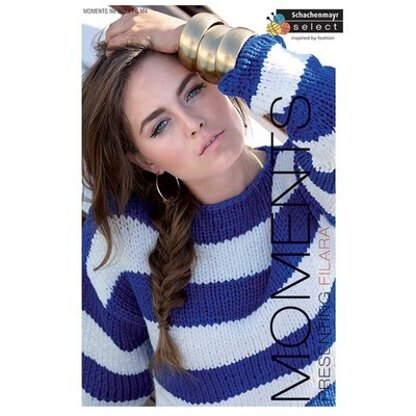 Schachenmayr Moments 027 contains 10 designs made using the new Schachenmayr Select Filara yarn. This particularly bulky, shiny yarn is worked into summery designs for cooler evenings. Pullovers, cardigans and accessories shine in bright colors.