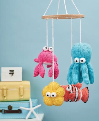 These Sea Babies have big eyes and expressive faces. Suspended on a mobile, they give the illusion of bobbing about under water; the movement will fascinate baby as they float about above them, and the bright tropical colours brighten up the nursery. Try inserting small bells into each animal to give baby a musical treat, too! Designed by Amanda Berry @fluffandfuzz, the toys are knitted on a pair of single pointed needles (not in the round). A third needle is needed for the clown fish pattern which incorporates a three-needle bind off. Each toy (clownfish, crab, octopus and starfish) is worked in acrylic DK yarns. An embroidery hoop is used to make the mobile, which is a cheap alternative to mobile making kits, and the toys are suspended on single crochet chains. For confident beginners and above, other techniques used include casting on and off, knits, purls, increases and decreases, knitting stripes, and seaming to finish.