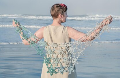 Drape yourself in elegance with the Sea Star Shawl, a cluster of star-shaped motifs reminiscent of starfish meeting in a tidepool, perfect for adding a splash of glamour and color to any outfit. This modular crochet design grows seamlessly as each star is connected to the previous motifs for minimal finishing, and the Faroese-style truncated V shape sits nicely on the shoulders.