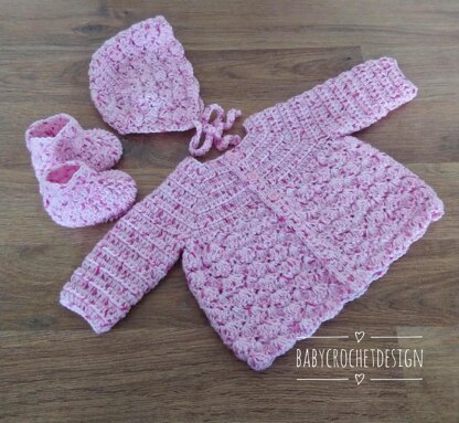 This cute set has a cardigan, bonnet and boots. The cardigan is crochet from the top down starting with half double crochet (half treble UK) dividing for armholes then doing a shell stitch to the bottom half.