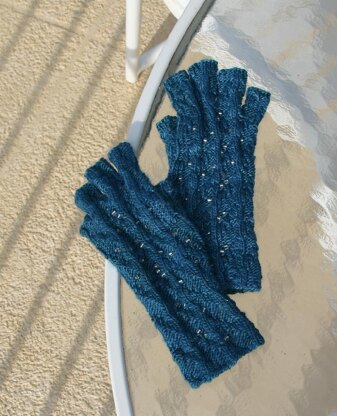 “If you’re like many knitters, during the height of summer you may find yourself impatient for the brisk days of fall and even winter, when you can pull out those woollen items created with long hours of pleasant labor. And yet– human nature being what it is– during those wintry periods, even knitters may find themselves remembering with longing those lazy hours on the beach in July or August: the penetrating heat of the sand, the glints of light off the water, the cooling salt spray flying off the crests of the waves. That’s why these gloves are a perfect anytime project: during the warmer months, they’ll augur frosty days to come, and once those days arrive, the wavy stitches, deep ocean teal and crystal bead droplets will remind you of those carefree seaside afternoons."