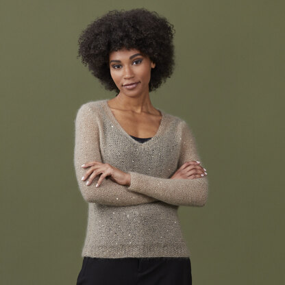 Haley from Sesia is a stunning women’s v-neckline pullover knit in Bluebell that will have you noticed! This sweater is perfect for a night out with its subtle sparkle over a lacy camisole. Haley is knit flat in pieces from the bottom up and then seamed with a seed stitch around the hem and the cuffs. Bluebell from Sesia is an elegant blend of mohair, silk, and sparkling sequins that creates a refined look.