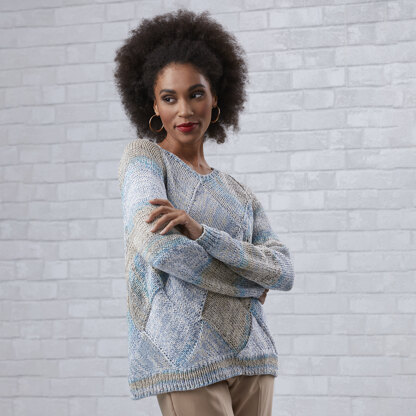 Sesia Rosie Pullover is a stunning raglan sleeve women’s sweater knit in Batik, two strands of cotton yarn held together with a shimmery strand of tinsel, giving this yarn a cool patterning! The pullover is knit in the round from the bottom up. The body of the sweater is worked using the entrelac technique, and the sleeves are knit flat and then seamed. The neckband stitches are picked up and then worked in the round.