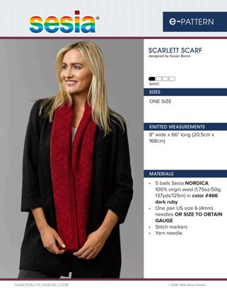 Sesia Scarlett Scarf PDF is a Knitting pattern by Susan Baron, available as a Downloadable PDF. Super fun to make, this pattern could be your next masterpiece!