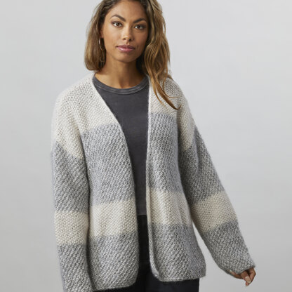 Sesia Teagan Cardigan is a fabulous women’s loose-fitting striped cardigan knit in Rebelle. The sweater features dropped shoulders, stripes with seed and moss stitch patterns, split-side hem. Teagan is knit flat in pieces from the bottom up and then seamed. Rebelle by Sesia is a blend of mulesing-free extra-fine Merino wool, mohair, and silk that gives projects a marled look and is perfect for lofty sweaters.