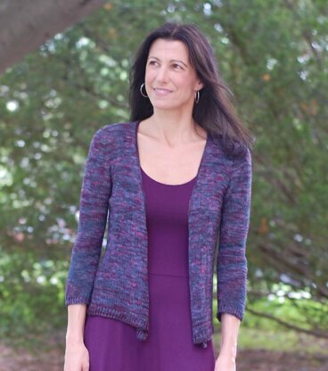 A reinterpretation of Lyrical Knits’ Simplicity Cardigan, this design has set in sleeves, more front coverage at the upper bodice, less pointy fronts, and trim to tame the curling at the edges and hem.