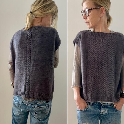 Seve is worked seamlessly from the top down. Both the front and the back are worked in Stockinette stitch with a slip stitch pattern in the center. There is no difference in shaping with this sweater which means that you can wear the wide pattern panel either way. Knitting starts with the cast on of the upper back (shoulders and neck). Once the short row shaped shoulder slope is done, the back is worked flat to underarm. To work the front to the same length, the shoulder stitches are picked up from the cast on edge of the back and the front neck is cast on. At underarm both front and back are joined to work the body top down in rounds to the bottom hem (optional split hem instructions are given). For the long sleeve version, stitches are then picked up around the arm openings to work them top down in rounds. No finishing required.