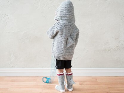 PDF crochet pattern for Children's Shark Hoodie with matching Shark Socks. Fun whimsical design features shark hood with teeth, white torso with zipper and dorsal fin on the back of hoodie. Worked in a half double and single crochet stitches. Quick sock design is worked in double crochet stitches with shark teeth and dorsal fin.