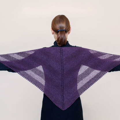 Shibui Knits Umbria is a knitting pattern for a modern wrap with clean geometry that is highlighted by transparent striping. Tweed Silk cloud and Lunar is paired in alternating bands, providing a contrast between solid and ethereal. Its versatile triangular shape offers a variety of styling options; drape it across the shoulders for a traditional look, or wrap firmly around the neck as a scarf. The shawl is knit in a striped pattern with both yarns held together, alternating with a single strand of Tweed Silk cloud.