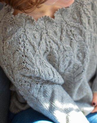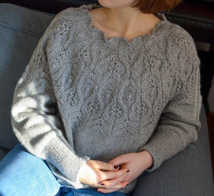 It is a seamless top-down sweater with a scalloped neckline and an intricate lace pattern on the yoke while the rest is made in simple stockinette. The range of ease across all the sizes is 16-18 cm/6.5-7.25”. The picture shows size 3 with 18 cm/7.25” of positive ease.