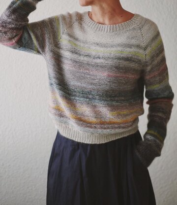 This sweater is worked seamlessly in rounds, in one piece from the top-down in Stockinette Stitch with 2 threads of fingering weight yarn held together throughout. Beginning with the collar, the neck is then shaped by short rows and the yoke is worked by raglan increases down to the sleeve separation. The sleeve stitches are placed on hold, underarm stitches cast on, and then work the body to the bottom ribbing. The sleeve stitches are placed back onto the needles to work in Stockinette stitch in the round.