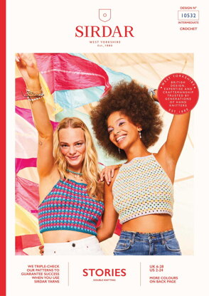 Sirdar 10532 With The Band Vest is a lovely and easy-to-crochet women’s sweater worked in Stories. It involves crocheting granny strip stitches, but it is in no way granny-style, with its cropped hem, halter neck, and tie-back features. Sirdar’s Stories with so many colors to select from? This yarn is a cotton & acrylic blend perfect for kids’ clothes and accessories! The crochet pattern is in written form only.