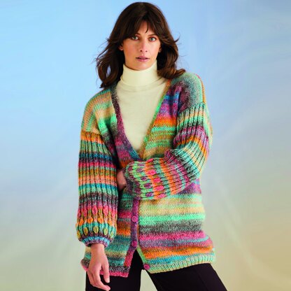 The Sirdar 10705 Coral Sleeves Cardigan has a dynamite combination of stripes on the body and texture on the sleeves that creates a unique sweater perfect for cold weather layering. A deep v-neckline and dropped shoulders give this cardigan a classic silhouette, and the sleeves pop worked in ribbing accented with embroidered clusters. The self-striping colors of Jewelspun with Wool Chunky add an extra dimension to finished projects and its machine-washable blend of acrylic and wool is easy to care for too. Knit flat in pieces from the bottom up and seamed, the Coral Sleeves Cardigan is a statement sweater that will add warmth and color to a whole range of outfits this fall and winter!