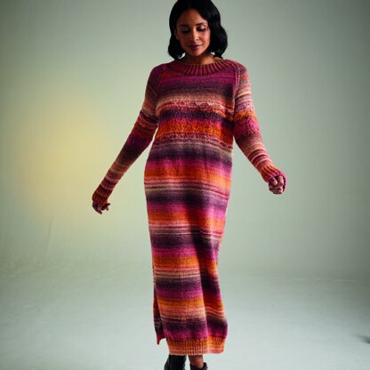 Step into fall in style with the Sirdar 10712 Tall Poppies Dress! This cozy dress is bursting with color thanks to the self-striping shades of Jewelspun yarn, and it has a texture boost from a gorgeous lotus stitch pattern. Jewelspun is a machine-washable yarn that combines the look of handspun yarn with an easy-care acrylic fiber to create vibrant finished projects that stand up to everyday wear and look great doing it! The Tall Poppies Dress is knit flat in pieces from the bottom up and seamed with a crew neckline, raglan shaping, and side vents at the hem for easy movement. Choose your favorite Jewelspun shade and make a statement dress to add to your handmade wardrobe!